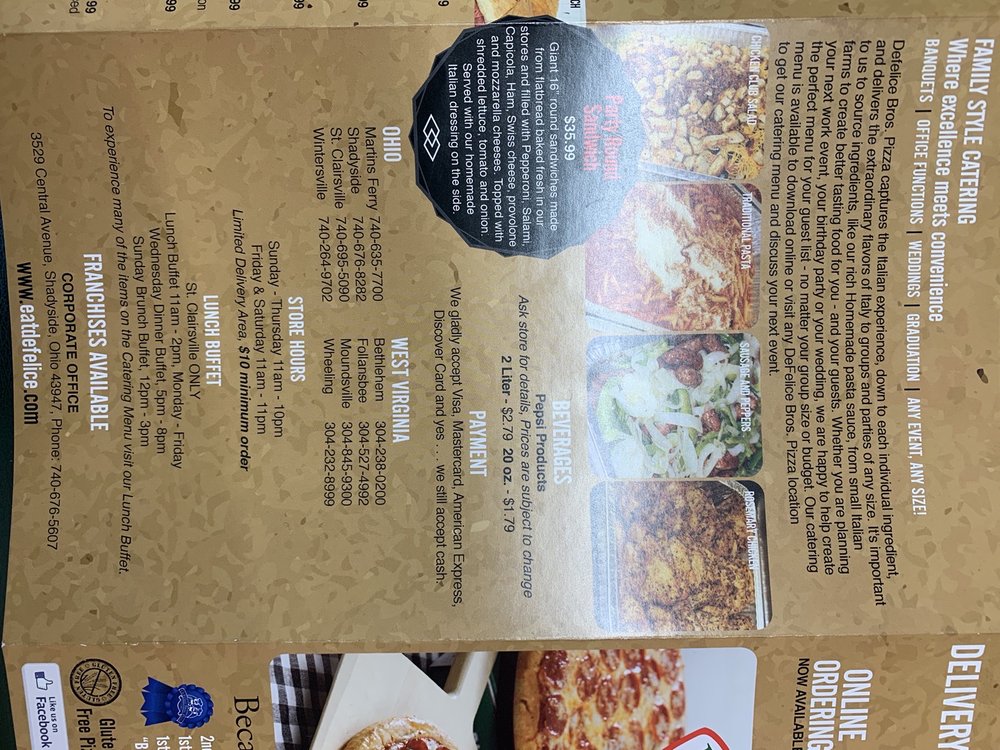 For inquiries or to place your order, call (740) 264-9702. Enjoy the culinary magic of DeFelice Bros Pizza!